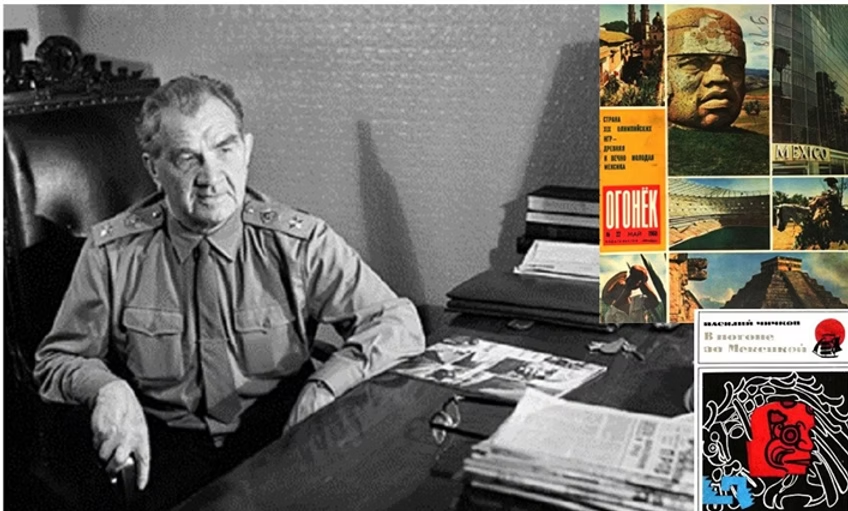 Pictured: Marshal Chuikov at his desk in Moscow, 19 June 1968, with thumbnails of the journal Oгонёк and Chichkov’s book В погоне за Мексикой (Chasing Mexico).