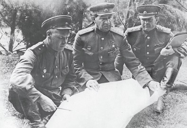 Pictured: Colonel-General V. I. Chuikov reviewing strategies with 8th Guards Army officers. Chuikov was photographed wearing his first Hero of the Soviet Union gold star (No. 1958), which was awarded to him on 19 March 1944.